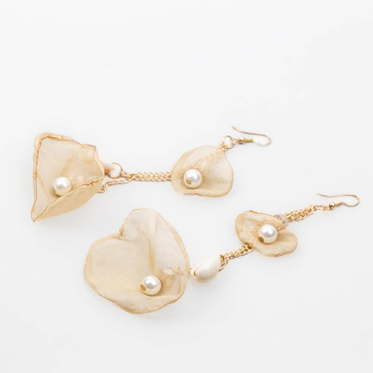 Cercei extra lungi cu petale delicate din material textil, pietre și perle - Bej