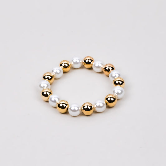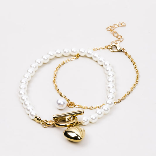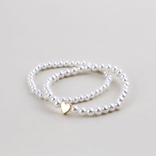 Set brățări elastice cu perle și charm în formă de inimă aurie, 2 buc - Alb