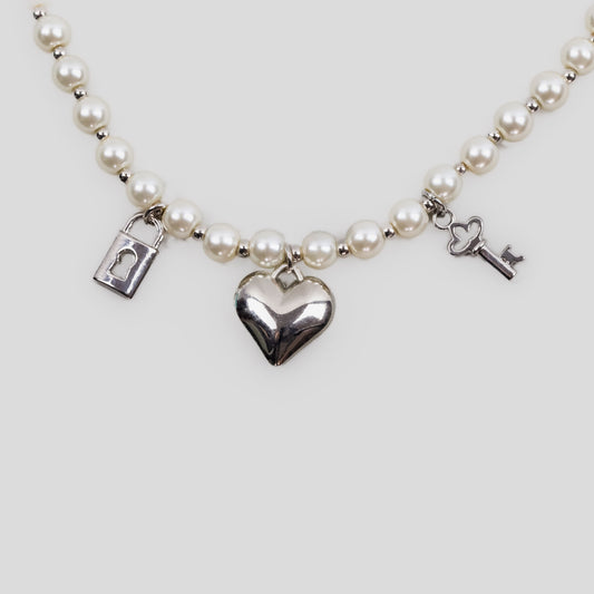 Brățară reglabilă cu perle și charm-uri cu inimă, lacăt și cheie - Argintiu