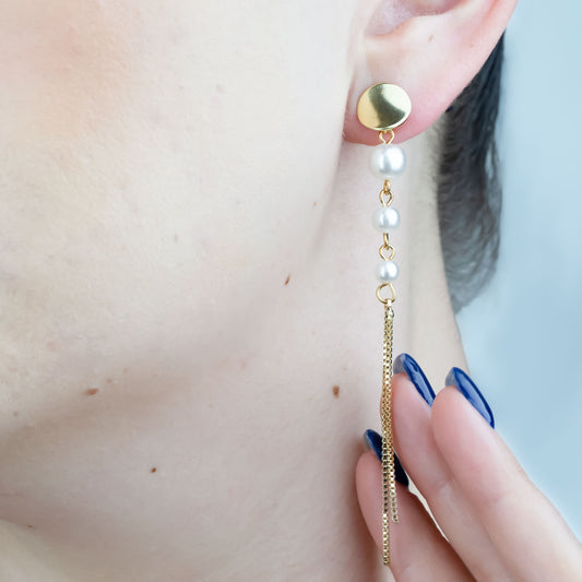 Cercei lungi cu perle, lănțișor și piatră - Auriu