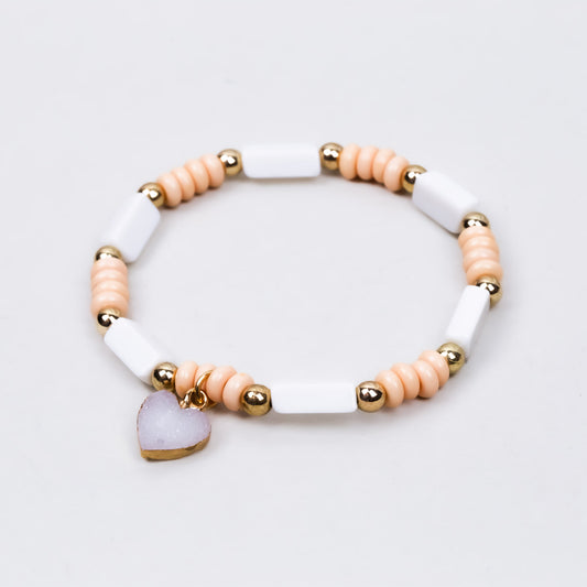 Brățară elastică cu mărgele, biluțe și charm în formă de inimă - Alb, Peach