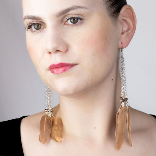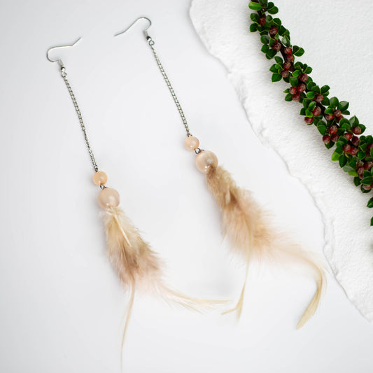 Cercei extra lungi cu pene pufoase și mărgele - Bej