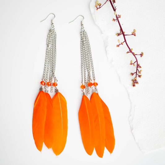 Cercei Ibiza extra lungi cu pene colorate și pietre - Portocaliu