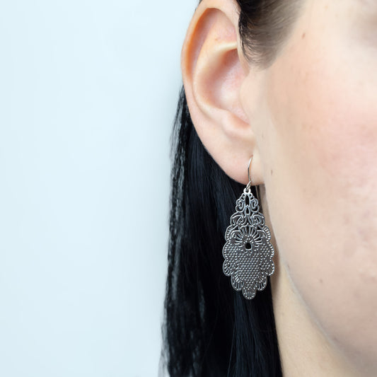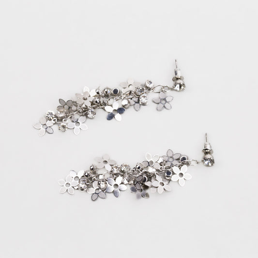Cercei lungi cu solzi în formă de floare delicată și ștrasuri - Argintiu