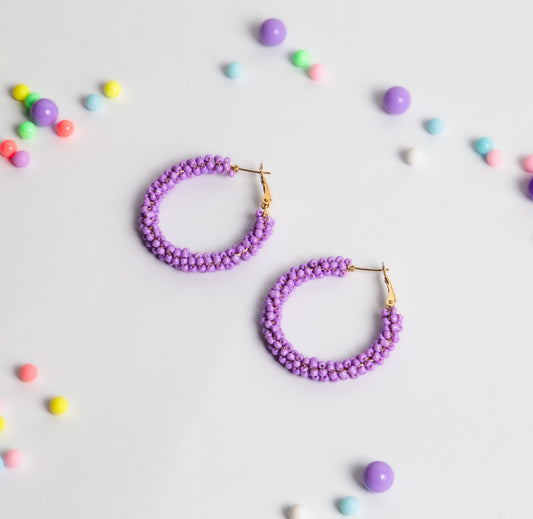 Cercei rotunzi aurii cu mărgele mici spiralate - Mov