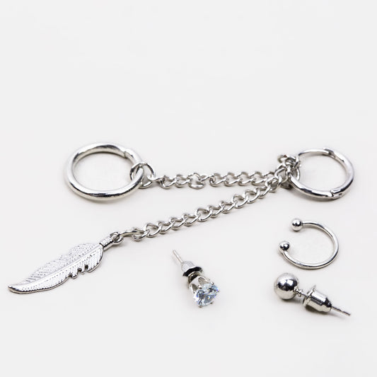 Cercei și ornament de ureche cu lanțuri și pandantiv, set 4 buc - Argintiu urban
