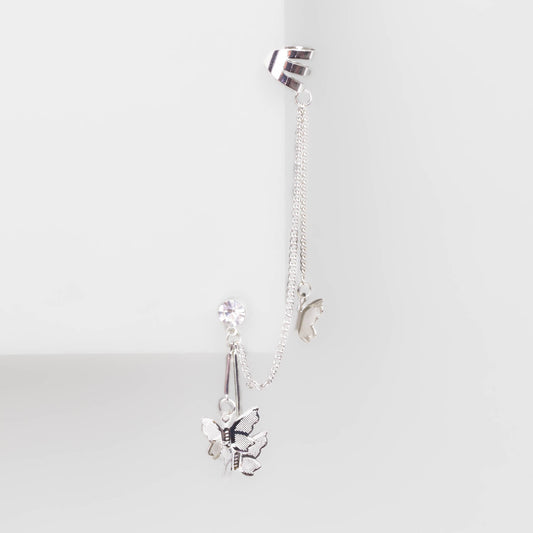 Cercel ear cuff cu lănțișor, pandantive cu fluturi și piatră strălucitoare - Argintiu