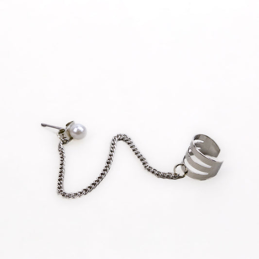 Cercel ear cuff cu lănțișor și cercel cu perlă mică - Argintiu