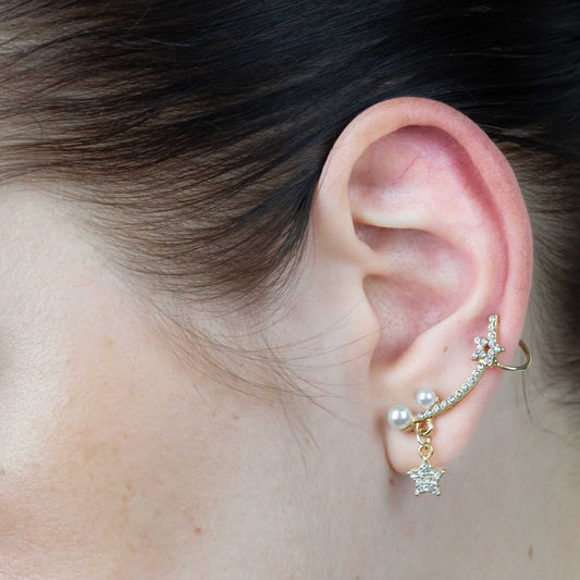 Cercel ear cuff cu ștrasuri și perle delicate, set 2 buc - Auriu stelar