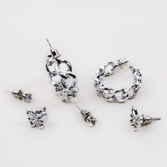 Set cercei cu verigă și fluture, 3 perechi - Argintiu