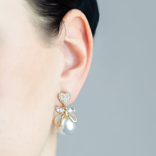 Cercei lovely princess cu inimă, fundiță și pietre - Auriu