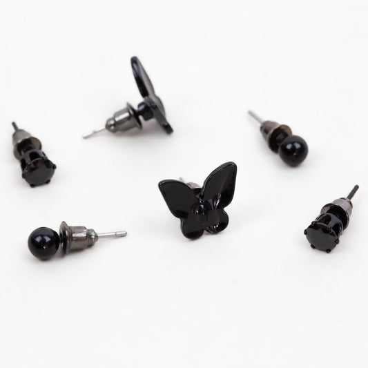 Set cercei mici cu pietre rotunde și forma de fluture, 3 perechi - Negru