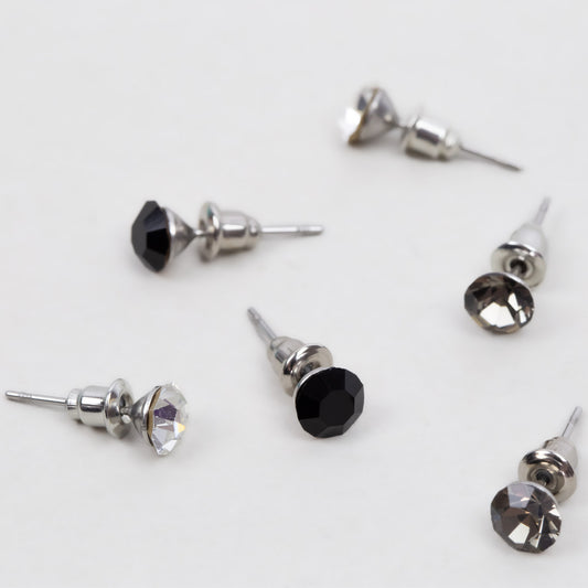 Set cercei mici cu pietre strălucitoare rotunde, 5-7mm, 3 perechi - Argintiu, baza argintiu