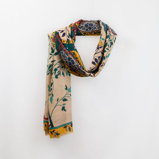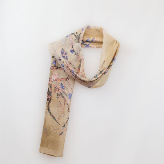 Eșarfă fină cu efect de mătase, imprimeu copac înflorit, 150 x 45 cm - Bej