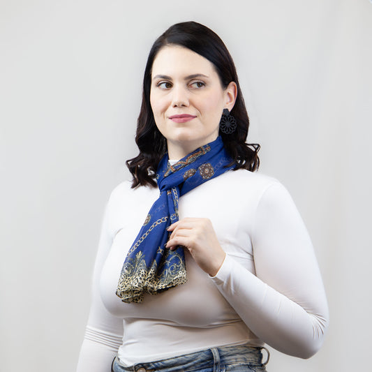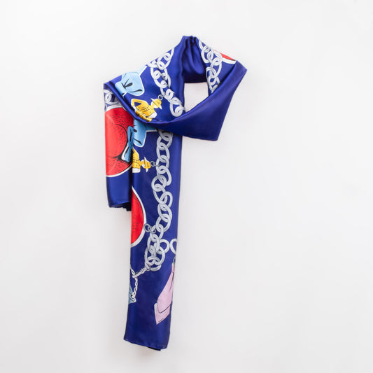 Eșarfă fină și deosebită cu efect mătase, imprimeu cu accesorii fashion, 180 x 90 cm - Albastru Indigo