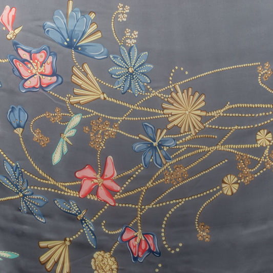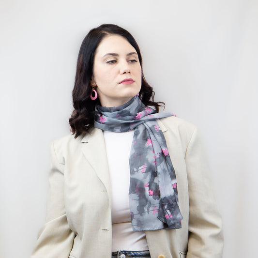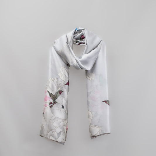 Eșarfă fină și deosebită cu efect mătase, imprimeu cu flori și fluturi, 180 x 85 cm - Gri