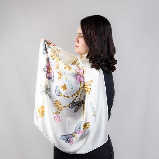 Eșarfă fină și deosebită cu efect mătase, imprimeu spring touch, 180 x 90 cm - Crem