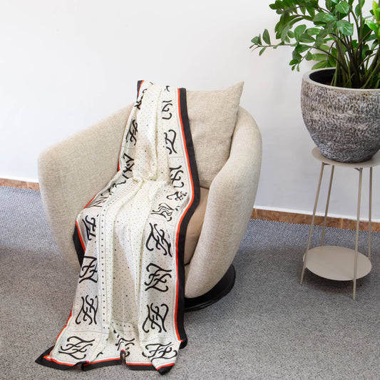 Eșarfă fină și deosebită din satin cu buline și semne abstracte, 180 x 85 cm - Crem
