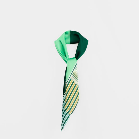 Eșarfă damă din satin, imprimeu cu dungi și secțiuni geometrice, 70 x 70 cm - Verde