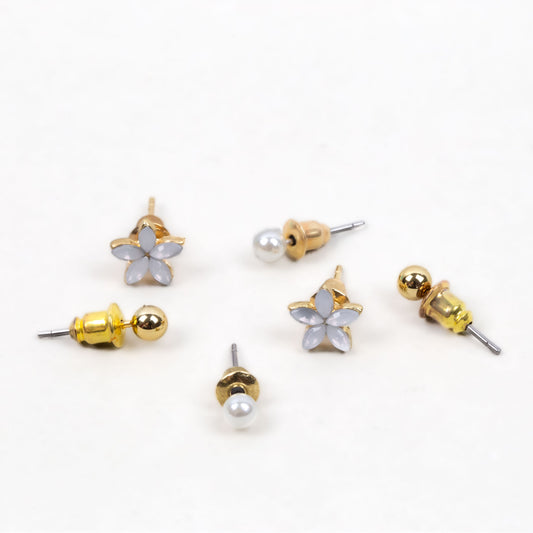 Set cercei mici cu biluțe și flori, 3 perechi - Alb, Auriu