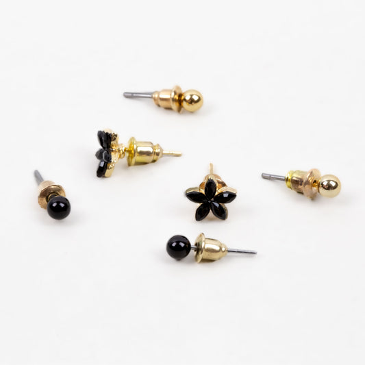 Set cercei mici cu biluțe și flori, 3 perechi - Negru, Auriu