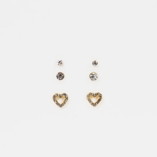 Set cercei mici cu forme de inimă și pietre, 3 perechi - Auriu
