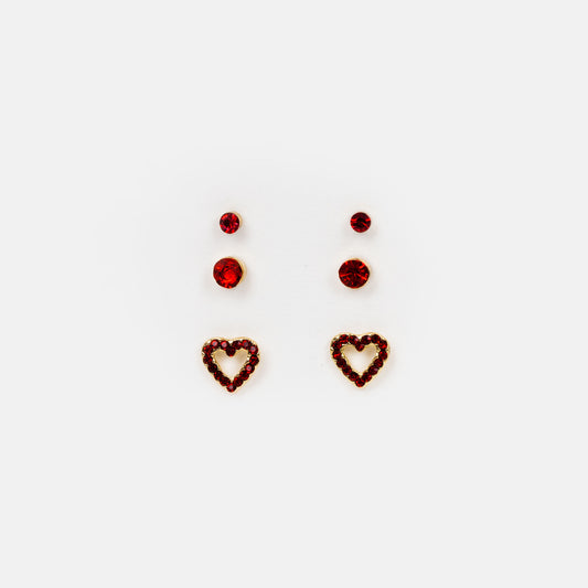 Set cercei mici cu forme de inimă și pietre, 3 perechi - Roșu
