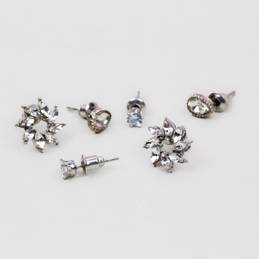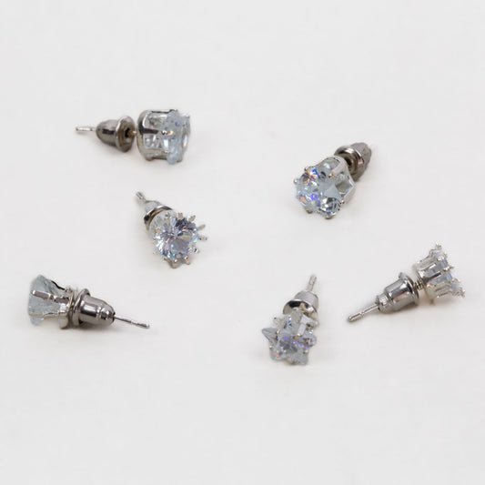 Set cercei mici cu pietre strălucitoare rotunde, 5-7mm, 3 perechi - Argintiu, baza argintiu