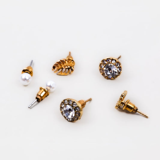 Set cercei mici cu formă de frunză și pietre, 3 perechi - Auriu