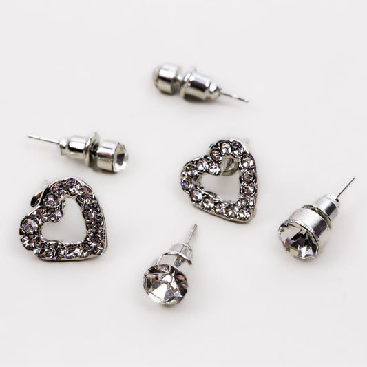 Set cercei mici cu forme de inimă și pietre, 3 perechi - Argintiu