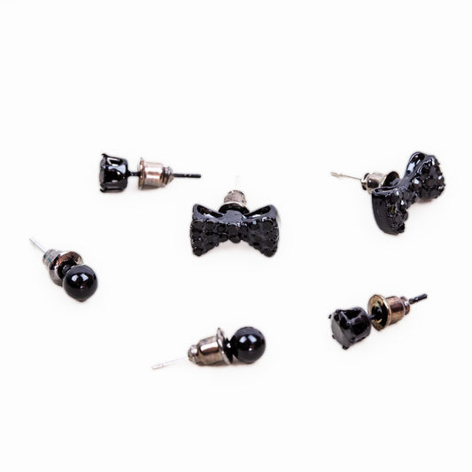 Set cercei mici cu fundiță și pietre, 3 perechi - Negru