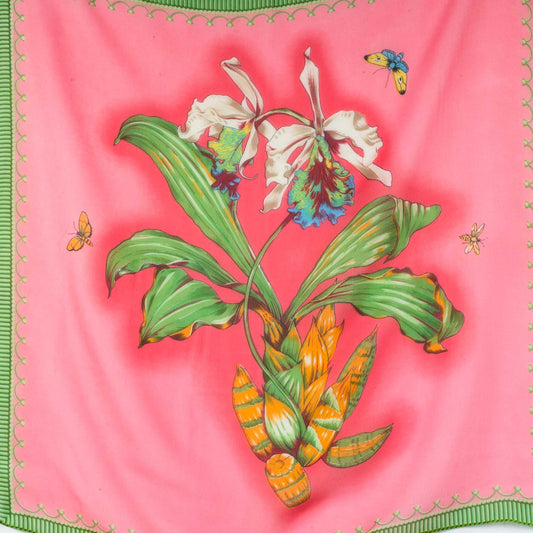 Eșarfă fină cu efect de mătase, imprimeu cu floare mare și fluturi, 65 x 65 cm - Roz