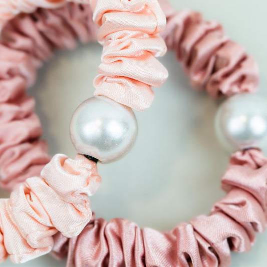 Elastice de păr din satin, tip scrunchie cu perlă, grosime 1,8 cm, set 2 buc - Roz Pudrat