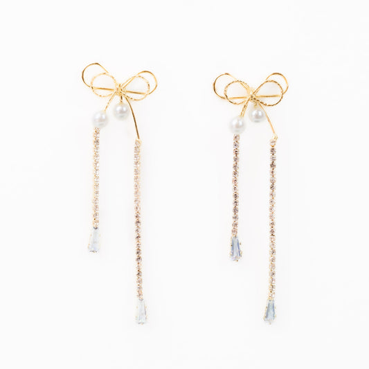 Cercei lungi cu fundită dublă, ștrasuri și perle - Auriu