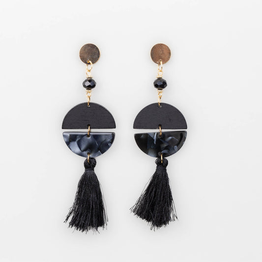 Cercei lungi cu semicercuri, pietre și franjuri - Negru
