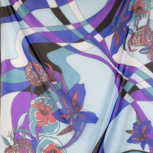 Eșarfă fină cu efect de mătase, imprimeu floral și forme abstracte, 65 x 65 cm - Albastru, Mov