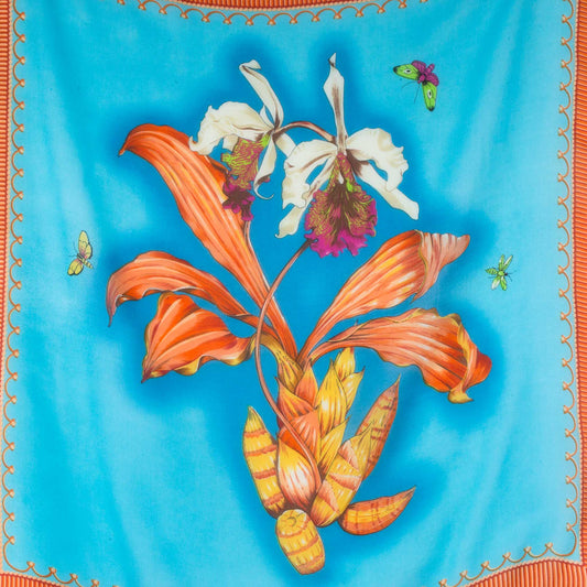 Eșarfă fină cu efect de mătase, imprimeu cu floare mare și fluturi, 65 x 65 cm - Albastru