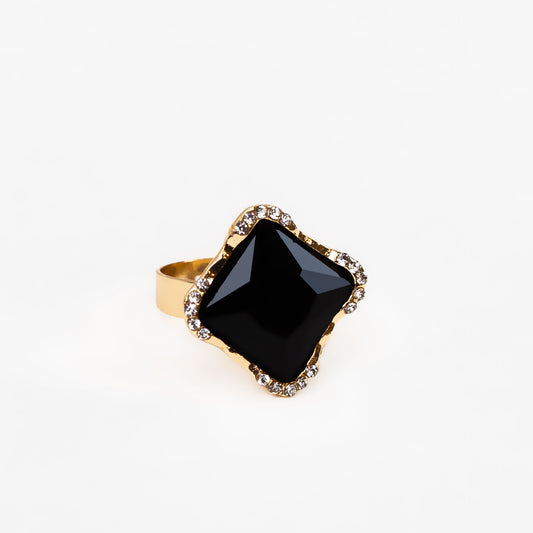 Inel reglabil cu piatră mare neagră și ștrasuri - Romb