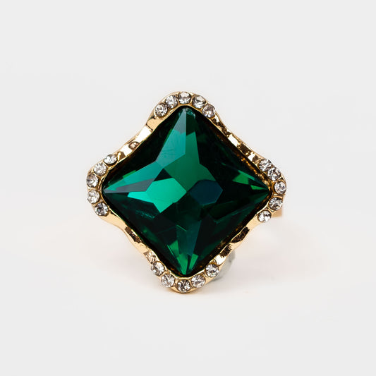 Inel reglabil cu piatră mare verde și ștrasuri - Romb