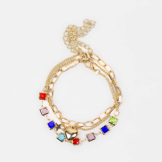Brățări reglabile cu lanț, pietre colorate și charm inimă, set 3 buc - Auriu