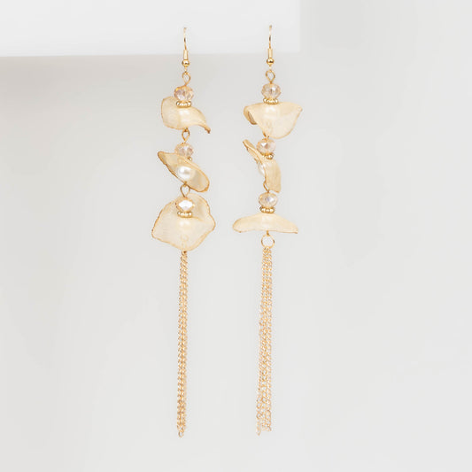 Cercei extra lungi cu petale delicate din material textil, pietre și perle - Bej