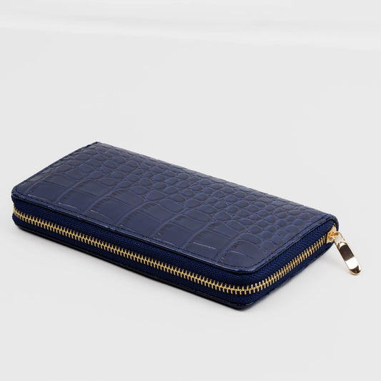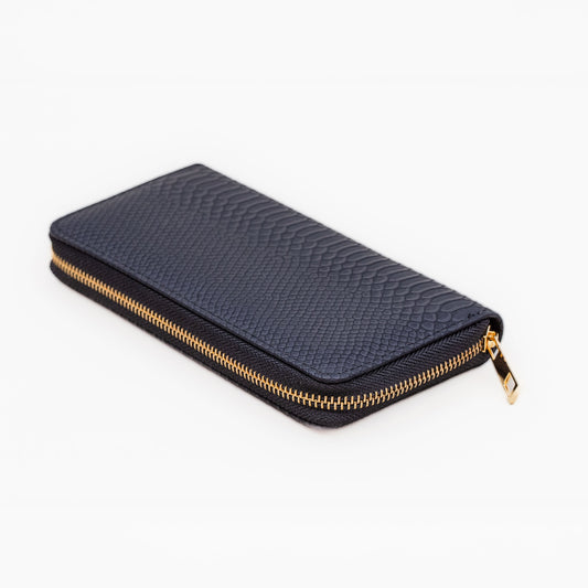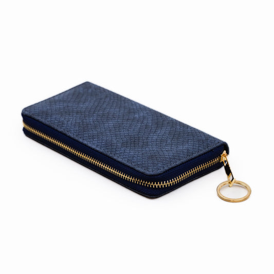 Portofel damă din piele ecologică cu fermoar, textură fină animal print, 14 compartimente - Albastru