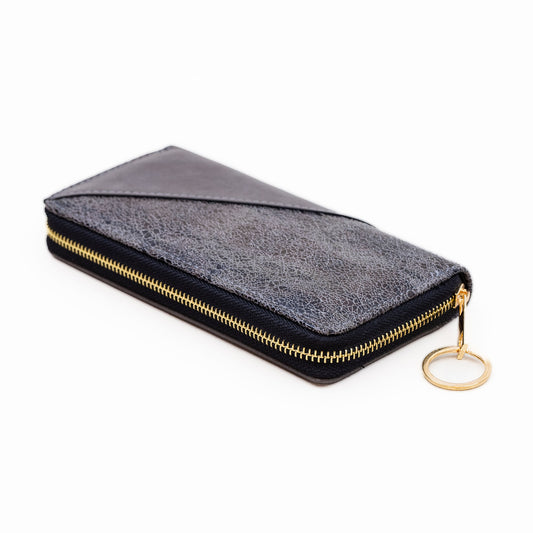 Portofel damă din piele ecologică cu fermoar, cusătură diagonală, 14 compartimente - Negru