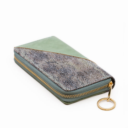 Portofel damă din piele ecologică cu fermoar, cusătură diagonală, 14 compartimente - Verde