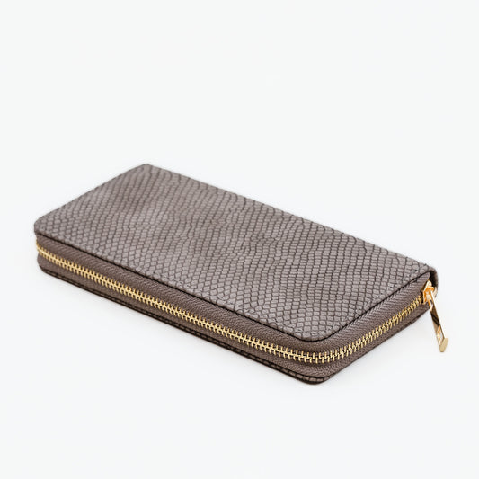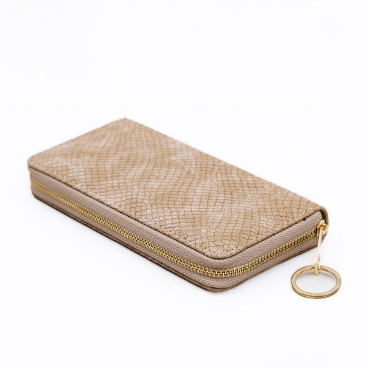Portofel damă din piele ecologică cu fermoar, textură fină animal print, 14 compartimente - Bej