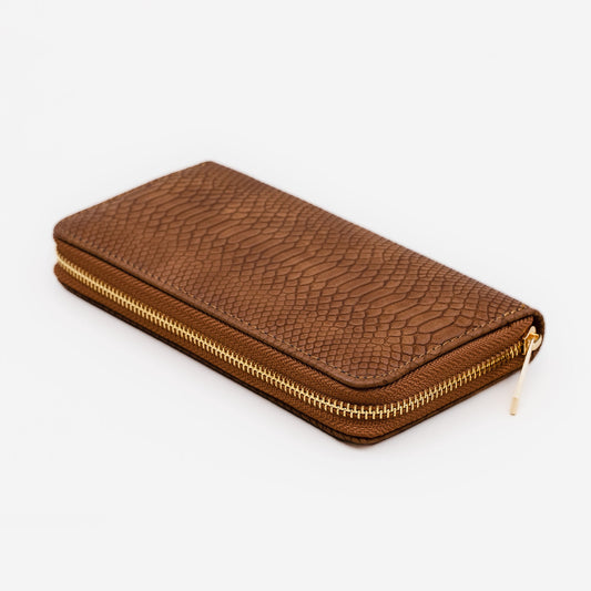 Portofel damă din piele ecologică cu fermoar, textură animal print, 14 compartimente - Maro