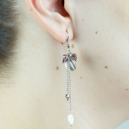 Cercei lungi cu scoici metalice și pietre mov - Argintiu