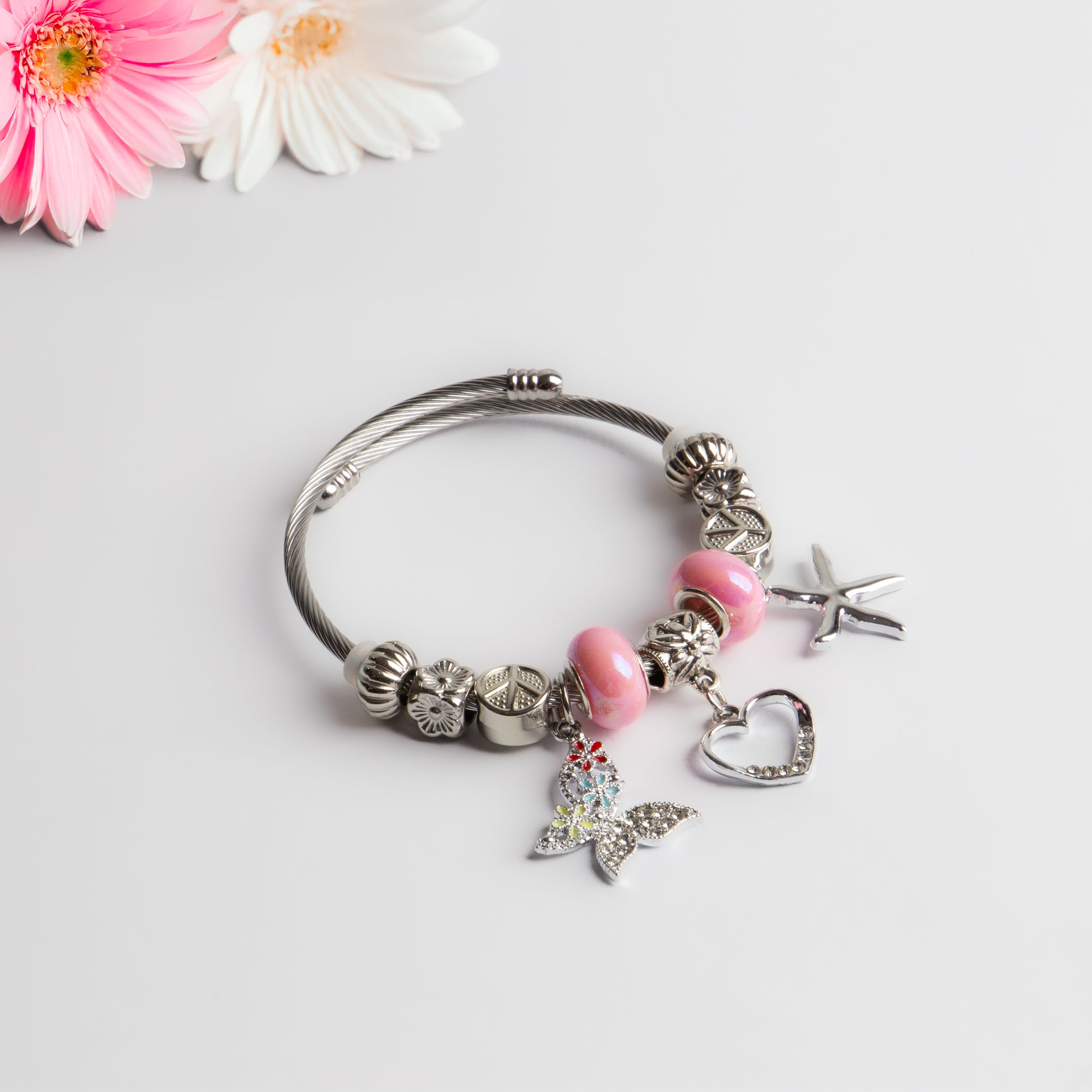 Adaugă un plus de rafinament ținutelor tale cu o brățară chic, ușor de purtat și asortat. Concepută cu detalii elegante și charm-uri delicate, această brățară este potrivită pentru orice încheietură oferind un confort maxim.