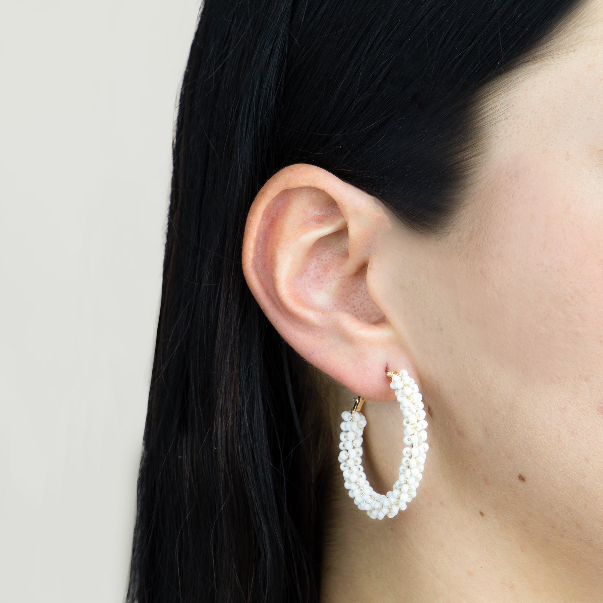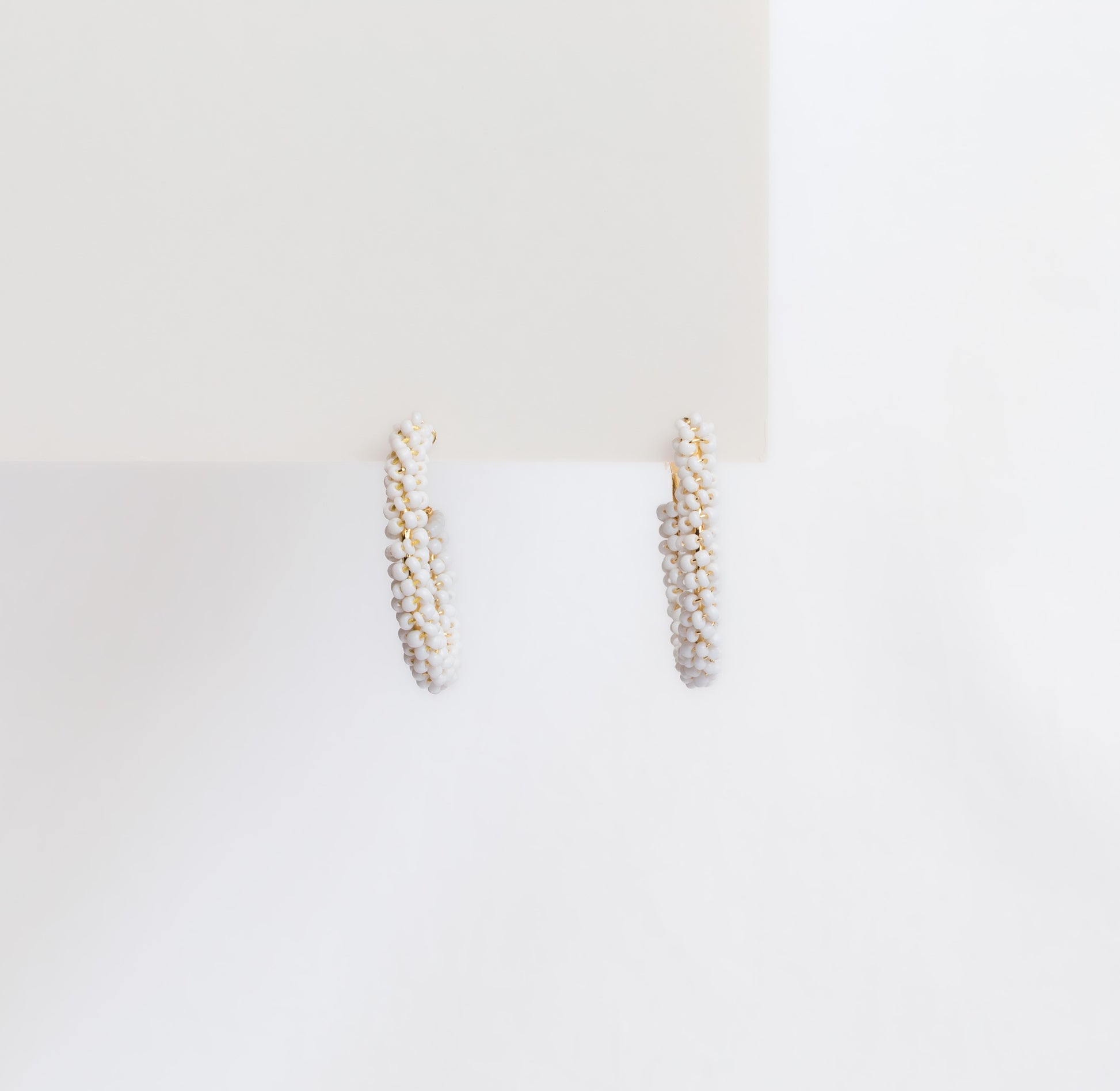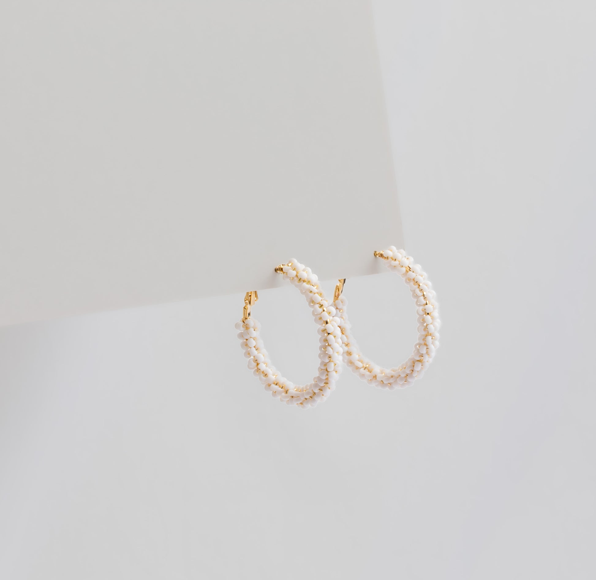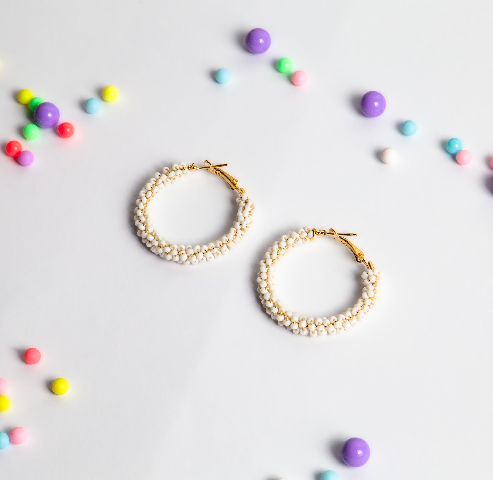Cercei rotunzi aurii cu mărgele mici spiralate - Alb