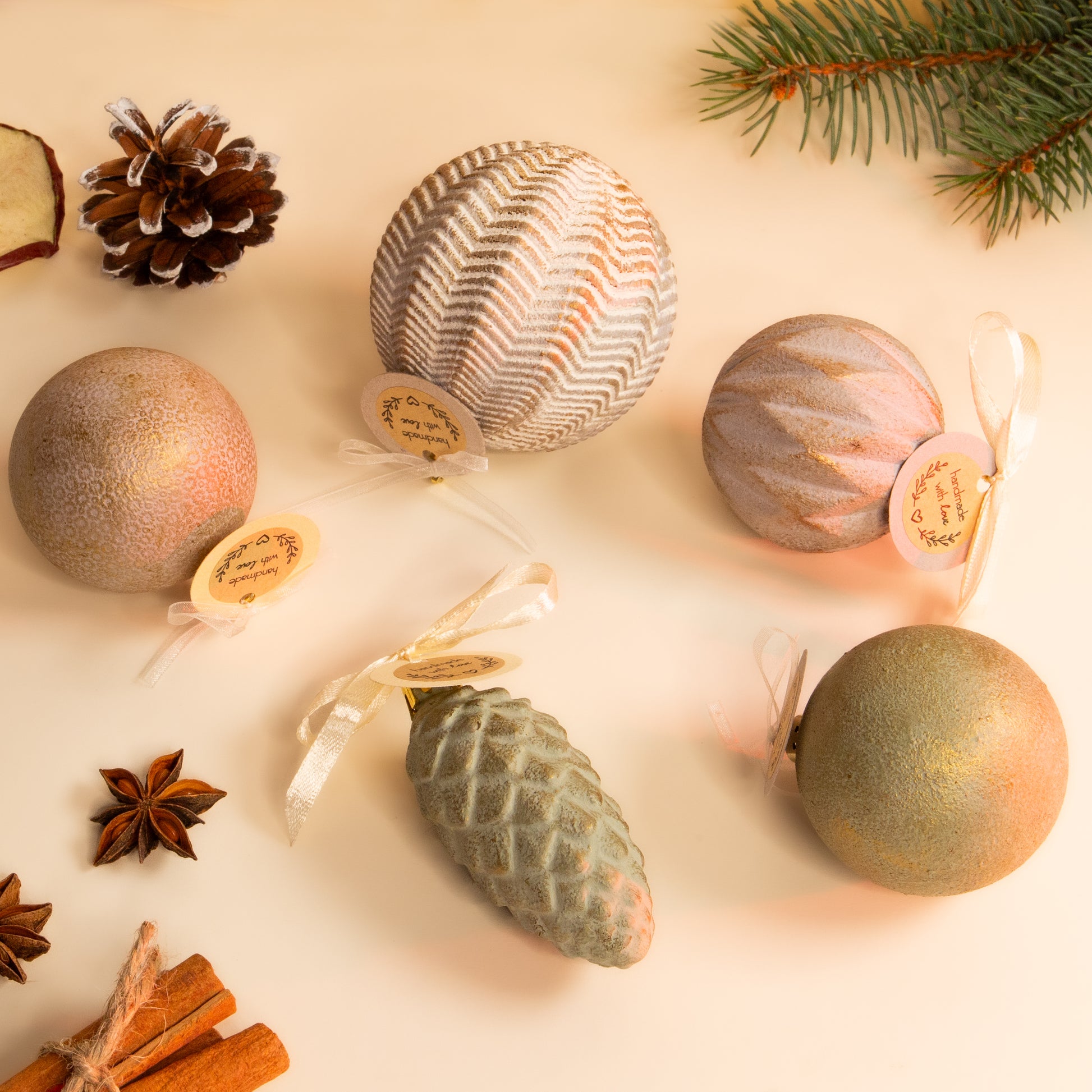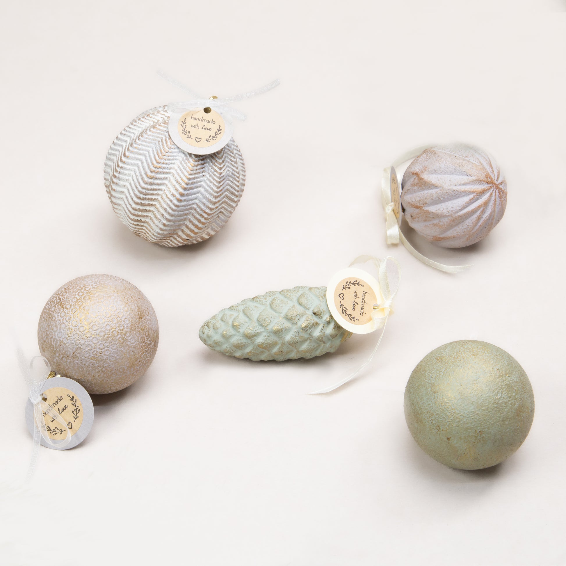 Set globuri handmade de Crăciun, cu finisaj vintage, diverse dimensiuni, 5 bucăți - Antique Woodland